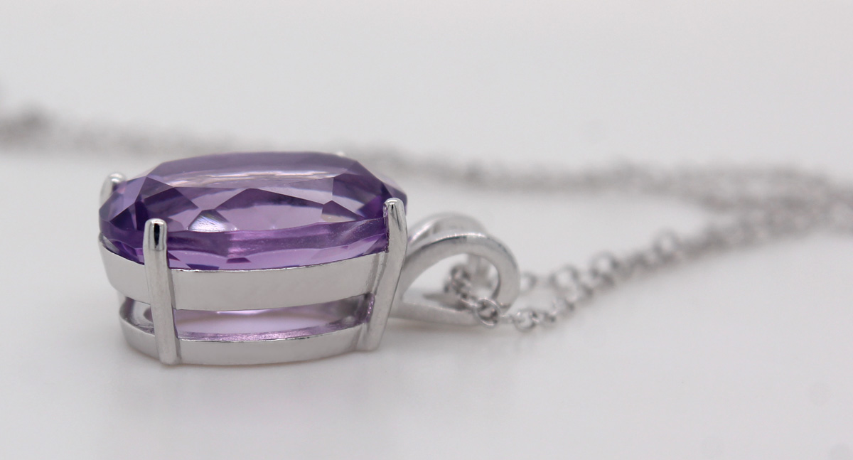 Amethyst Halskette Anhänger Silber 925 lila Natur Edelstein. Lila leuchtender Solitäranhänger mit einem imposanten brasilianischen Amethyst Edelstein. Anhängerbreite 10mm Anhängerlänge 19,2mm Kettenlänge 40cm (verlängerbar auf 5cm) Kettenstärke 0,7mm Gewicht 4,0 Gramm. Hingucker zeitlose Klassiker. klassisches Damencollier welches jedes Outfit aufwertet