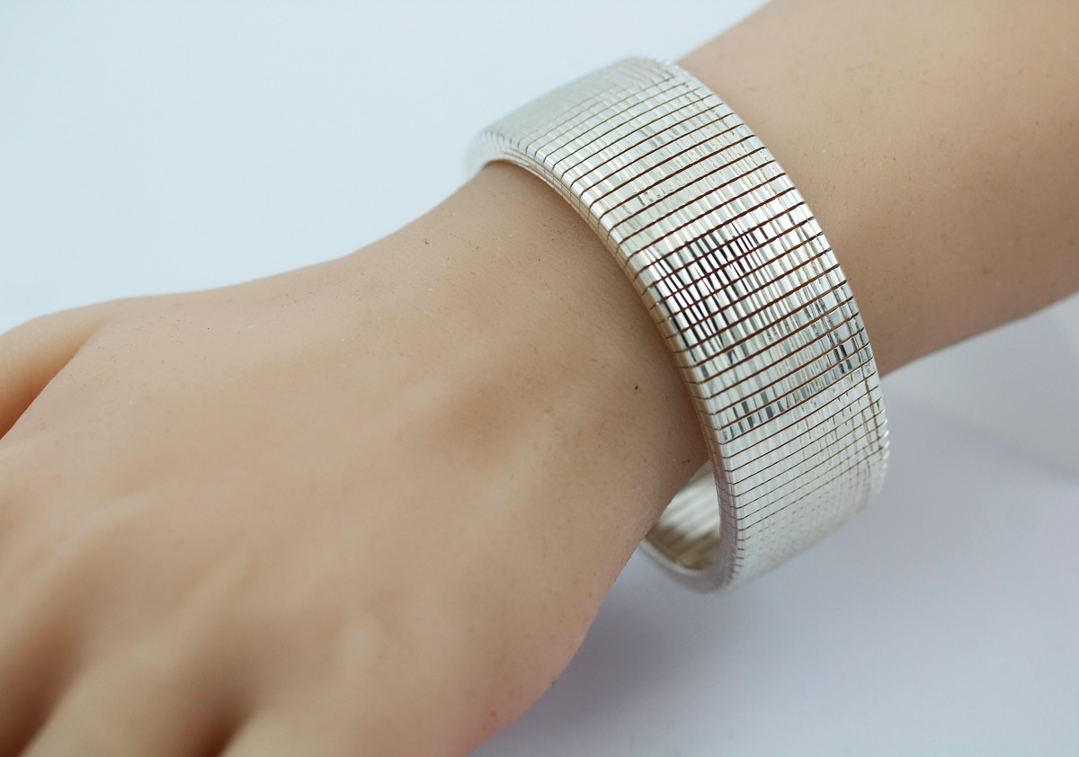 Armreif Silber 925 beweglich gemustert poliert rhodiniert. Durch seine flexible Machart passt sich das Armband jedem Handgelenk mühelos an. Breite 23,5mm, Stärke 4,1mm, Längen/Gewichte: 18cm- 35Gramm, 21cm- 39,7 Gramm. Damenarmband Damenschmuck. Feinster und zugleich romantischer Ring für jede Frau