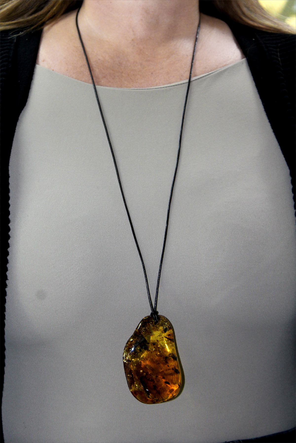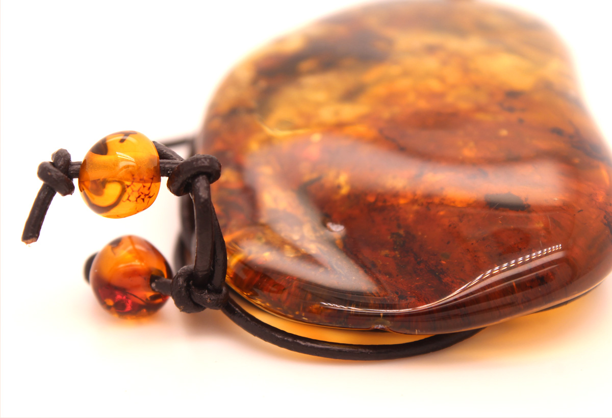 Seltener Baltischer Bernstein Naturfund mit ca. 357,00ct. in leuchtendem cognac-braun-honiggelb in TOP AAA Qualität an feiner verstellbarer Lederkette. Ein seltener Schatz aus der Natur, welcher garantiert alle Blicke auf sich ziehen wird. Kettenlänge 92cm bis minimal 23cm verstellbar, Gewicht 37,12 Gramm. Baltischer Bernstein Anhänger: Länge 76,6cm, Breite 50,1mm, Stärke 23mm (ca.357ct.). Ein wunderschönes Unikat dem viel Heilkraft nachgesagt wird,