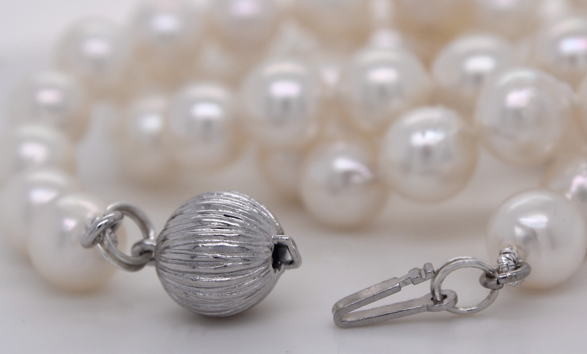 Japanische Akoyaperlenkette Sterlingsilber 925 Kugelschließe. Feine Japanische Akoyaperlen mit Top Weiß-rose strahlendem Perlenlustre von Hand aufgezogen. Schliesse: Kugelverschluss d:8,7mm in Silber 925, Gewicht: 29,0 Gramm, Kettenlänge: 41cm. Geschenkidee zeitloser besonderer Klassiker. Feinster und zugleich romantischer Stil für jede Frau