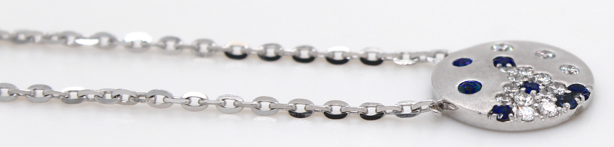 Goldkette Anhänger Weißgold 585 14K Natur Saphire Diamanten. Spezieller und zugleich traumhafter Schmuck für den Alltag oder auch zum Ausgehen. Länge 40+3+5cm, Anhänger: Durchmesser 11,7mm, Stärke 1,8mm, Kettenbreite 1,3mm, Gewicht 3,27 Gramm. Der wunderschöne fest angebrachte Anhänger erinnert an einen funkelnden Sternenhimmel. Damenkette Saphir Schmuck Brillantschmuck