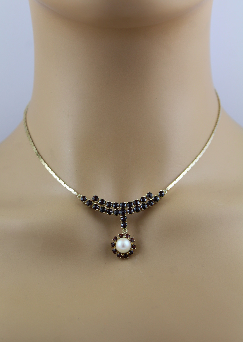 Granat Collier Gold 333 8K rote Edelsteine Akoyaperle Antikschmuck 40