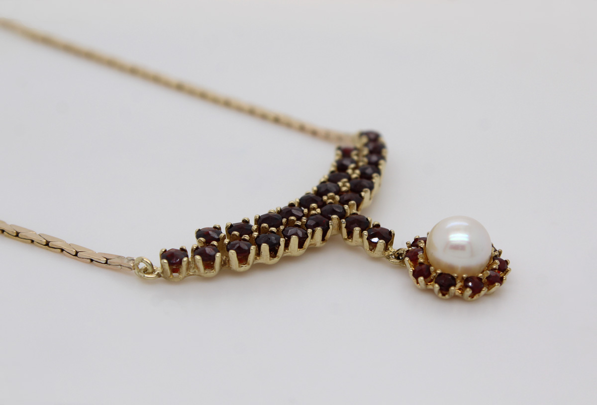 Granat Collier Gelbgold 333 8K rote Edelsteine Akoyaperle 7.6mm. Granate sind schon seit der Antike als Schmucksteine sehr begehrt und einem antiken Mythos zufolge, sollen die heiligen Granate von selbst aus ihrem Inneren leuchten können. Länge 40cm, Mittelteil LxBxH 32,2x43,6x7,7mm, 9,91 Gramm. Damenkette Edelsteinkette Edelsteinschmuck Perlenschmuck. Ein perfektes Geschenk für besondere Anlässe