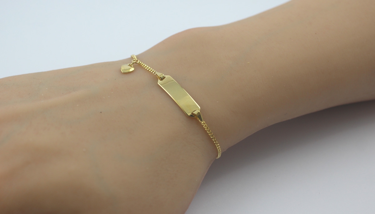 Gravurarmband Kinder 1,6mm Gold 585 14 Karat massiv Gravurplatte Panzerband poliert. Gelbgold 585 14 Karat Flachpanzerarmband Herzanhänger. Länge: 14cm Kettenstärke: ca. 0,7mm Kettenbreite: 1,6mm. 8 Buchstaben Gravurplatte Stärke:ca. 0,5mm Länge: ca. 20mm Breite: 5,4mm Gewicht: 1,9g. Kinderarmband Kinderschmuck