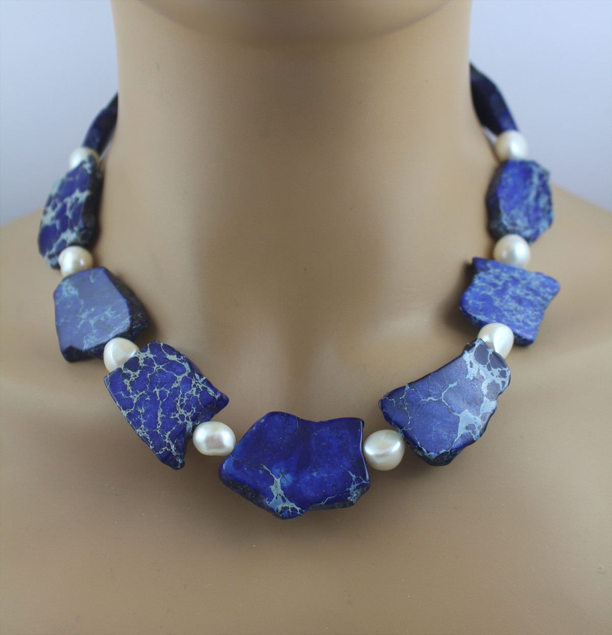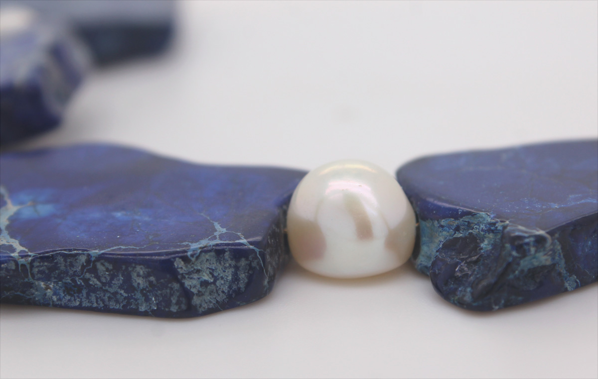 Kette weiße Süßwasserzuchtperlen blauer Natur Jaspis Silber 925 46