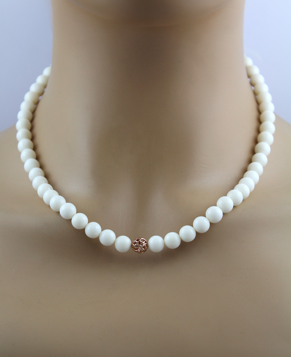 Korallenkette 45cm weiße Tiefsee Korallen 160ct Rosegold 585 14K. Die Kette ist aus fein geschliffenen, kugelförmigen Perlen weißer Tiefseekoralle aus Taiwan gearbeitet. 40,32 Gramm. Damenkette Damenschmuck Edelsteinschmuck Korallenkette. Ein zeitloses Schmuckstück, das Natürlichkeit und Luxus perfekt verbindet