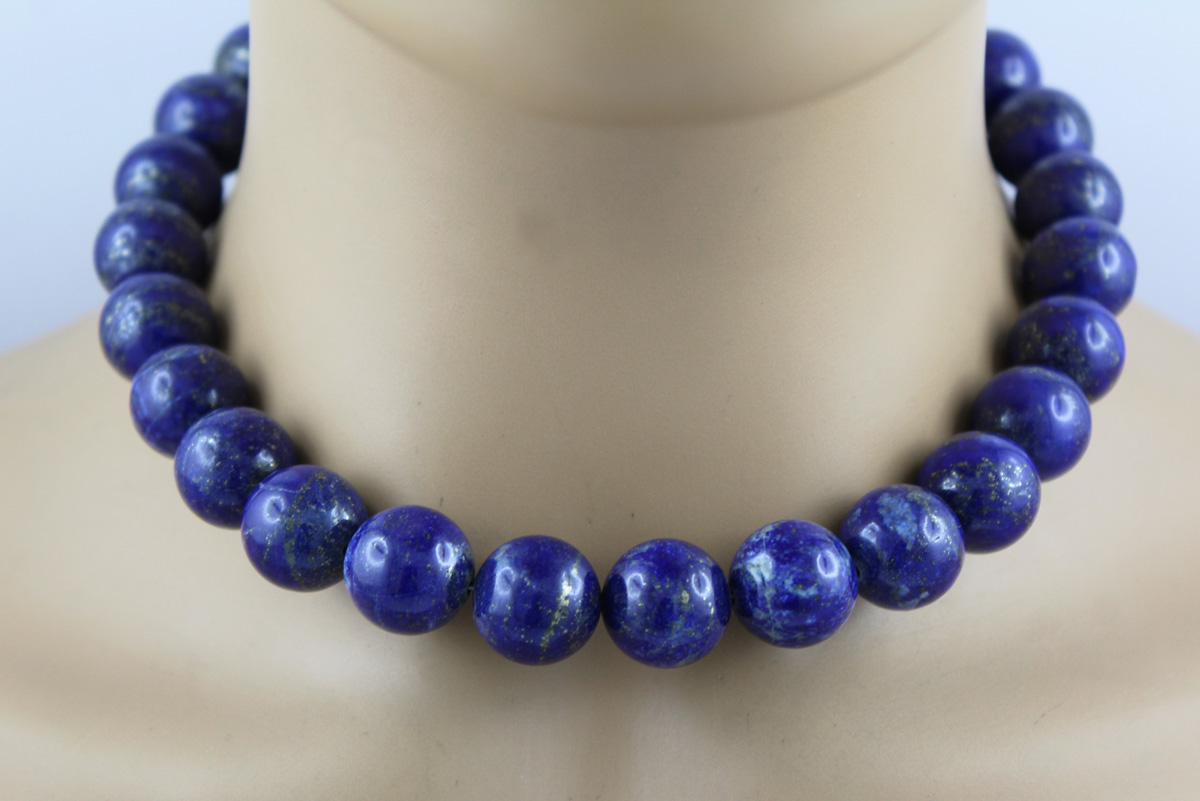 Edelsteinkette blauer Lapislazuli 16mm Silber 925 Karabiner. Der Lapis Lazuli ist auch als der Stein der Könige bekannt. Länge 42cm, Gewicht 157,88 Gramm, Lapislazuli Kugeln 16mm. Damenschmuck Edelsteinschmuck Damenkette. Geschenkidee zeitloser Klassiker