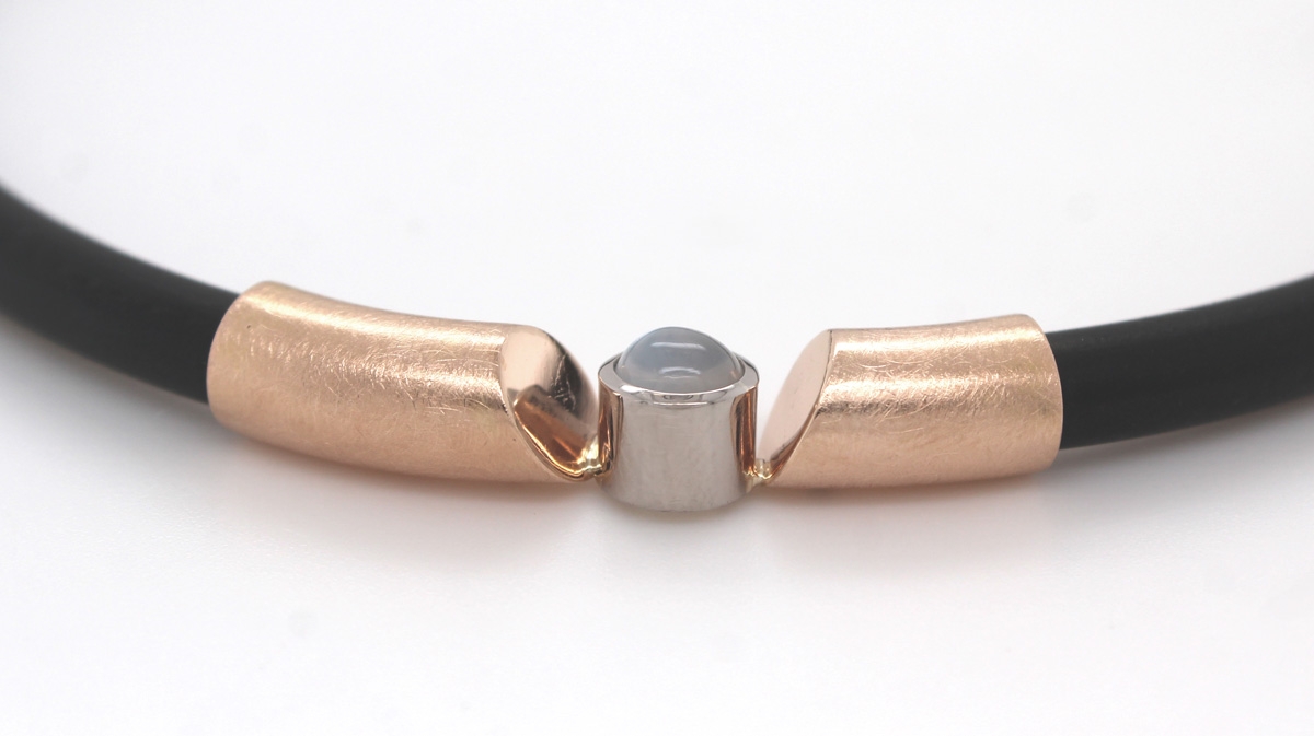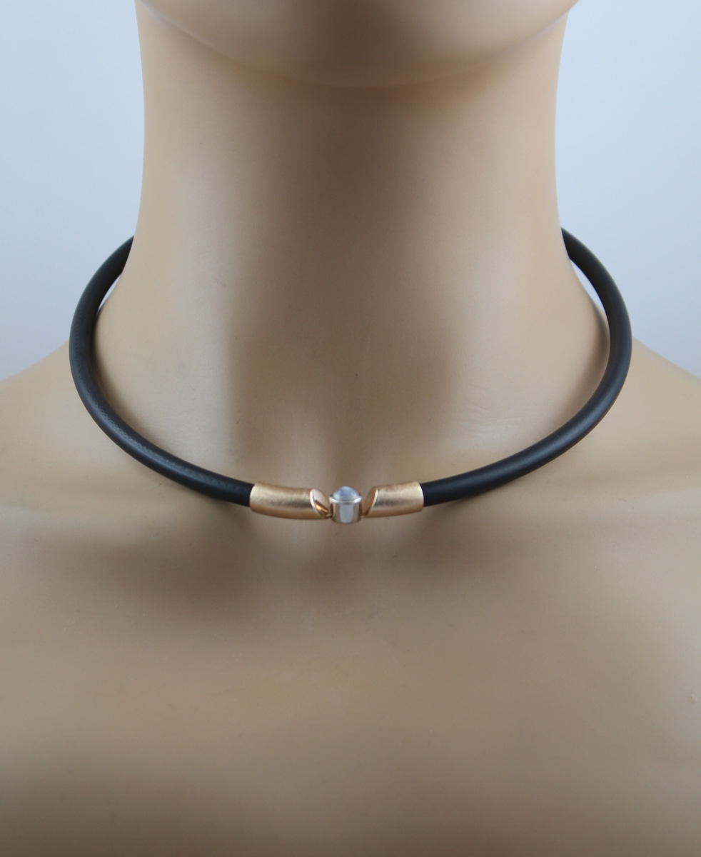 Mondstein Collier Rosegold 585 14K weißer Edelstein 1.2ct Kautschuk. Dieses außergewöhnliche Schmuckstück verbindet moderne Schlichtheit mit luxuriöser Raffinesse. Länge 44,5cm, Kautschuk Durchmesser 5,2mm, Anhänger LxBxH 47x7,4x7,2mm, 21,52 Gramm. Damenkette Damenschmuck Edelsteinschmuck. Die zarte, fast magische Aura des Mondsteins wird durch das warme Roségold perfekt ergänzt
