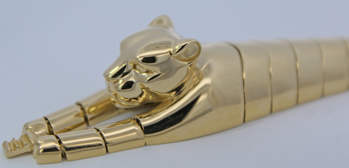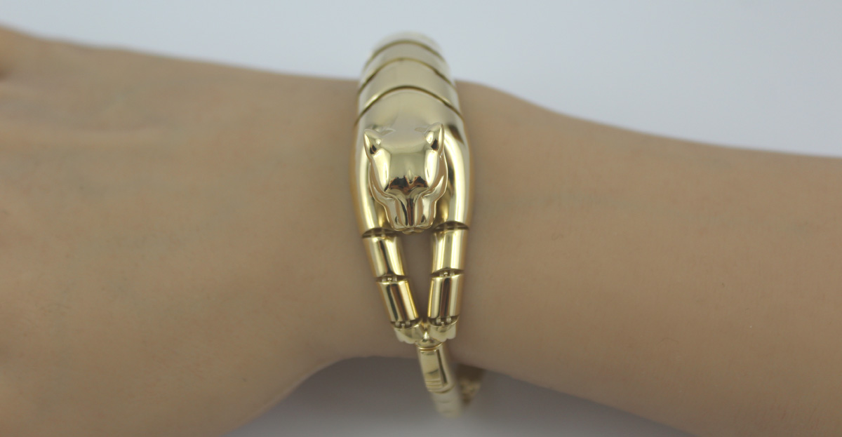 Panther Armband Gelbgold 585 14 Karat halbmassiv. Ein absoluter Hingucker, die Blicke werden ihnen sicher sein. Breite 5,3-20,3mm, Höhe 3,2-15,4mm, 19cm, 23,2 Gramm. Damenarmband Damenschmuck. Der Panther repräsentiert Stärke, Mut und Schutz