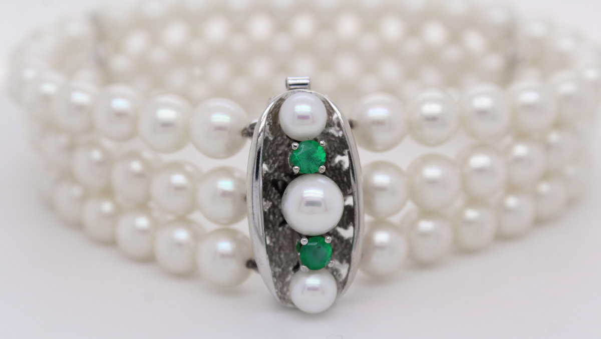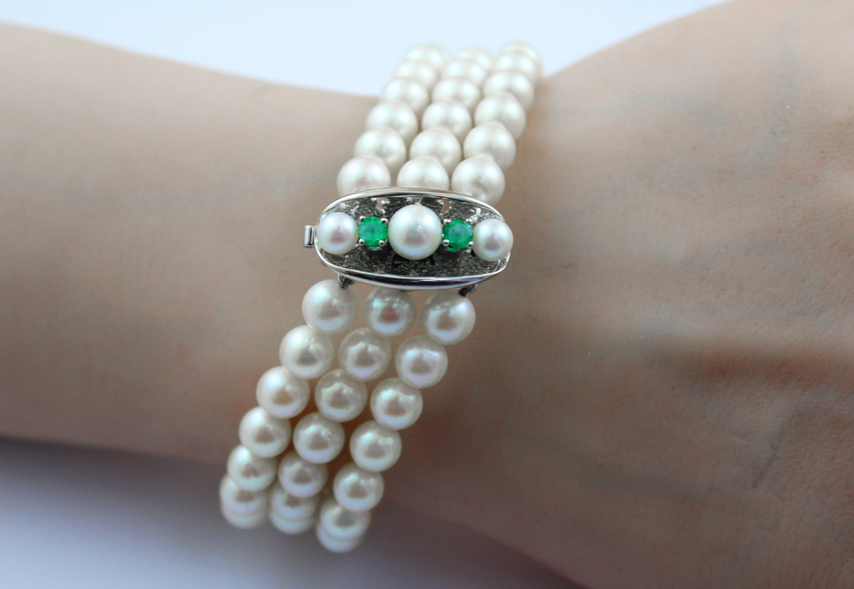 Perlen Armband Akoyaperlen Weißgold 585 14K Smaragde Antikschmuck 19