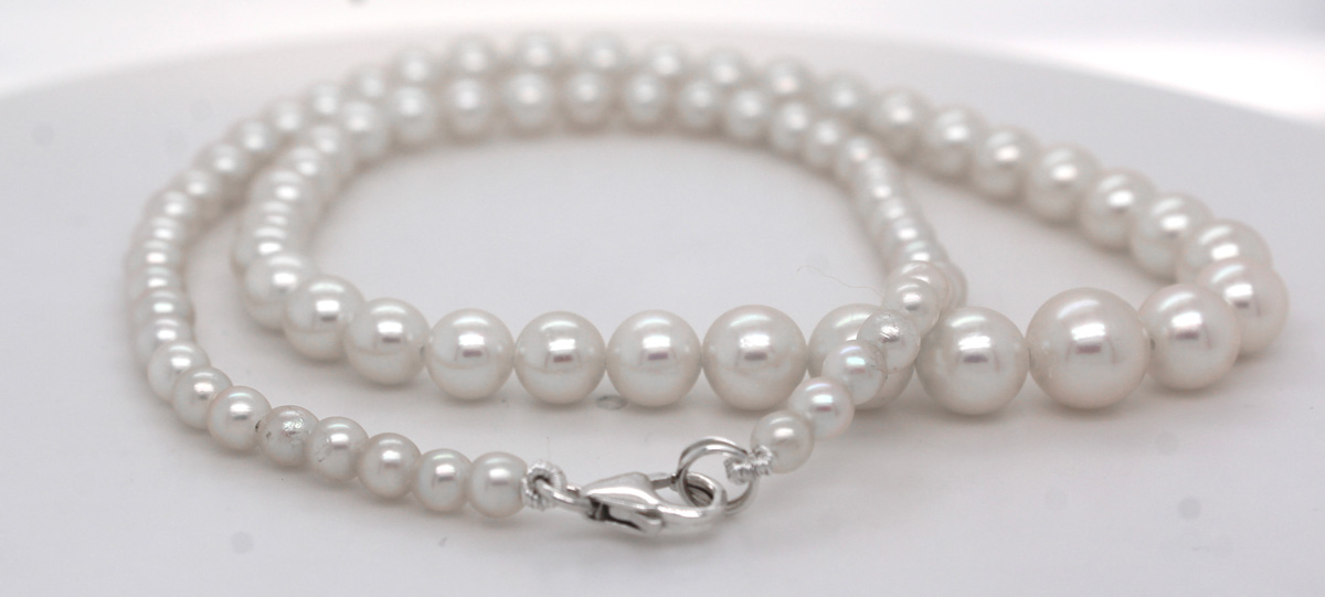 Perlenkette japanischen Akoyaperlen Silber 925 Karabiner. Schlichter und zugleich traumhafter Schmuck für den Alltag oder auch zum Ausgehen. Perlendurchmesser 3,6-7,3mm Länge 37cm Gewicht 12,90 Gramm. Hingucker zeitloser Klassiker. Ein zeitloses Accessoire, das in keiner Schmucksammlung fehlen sollte