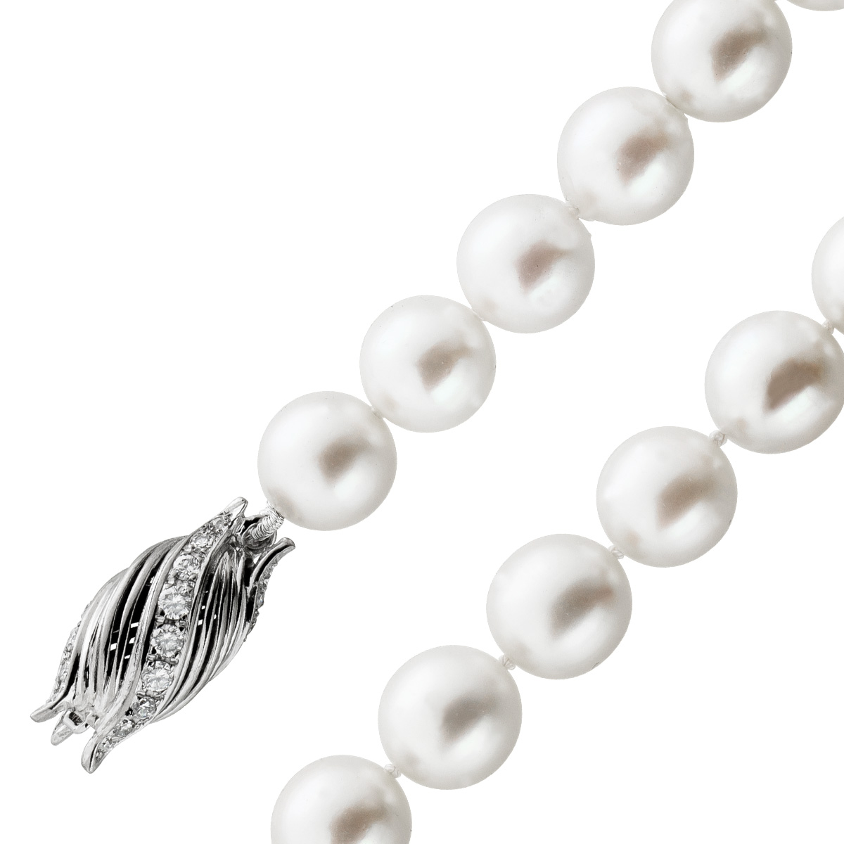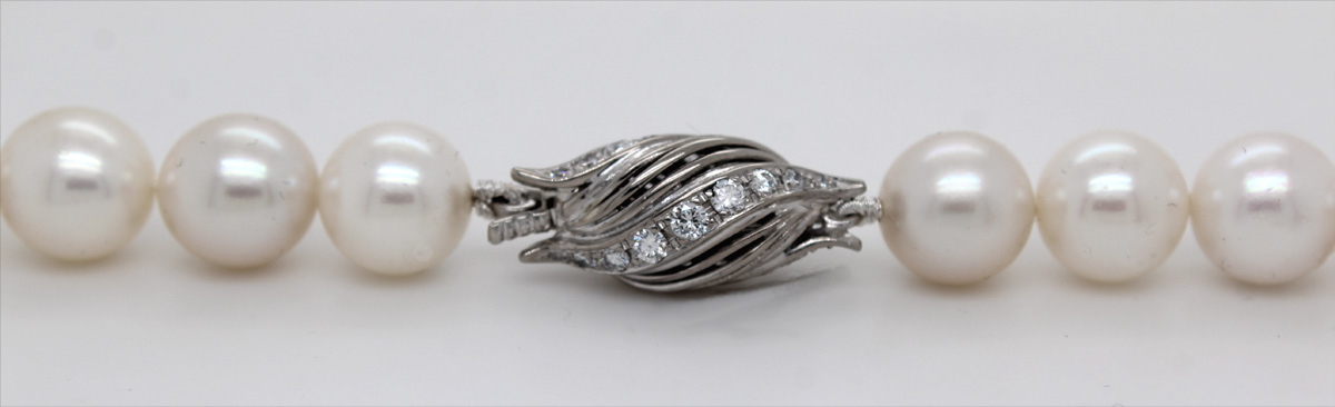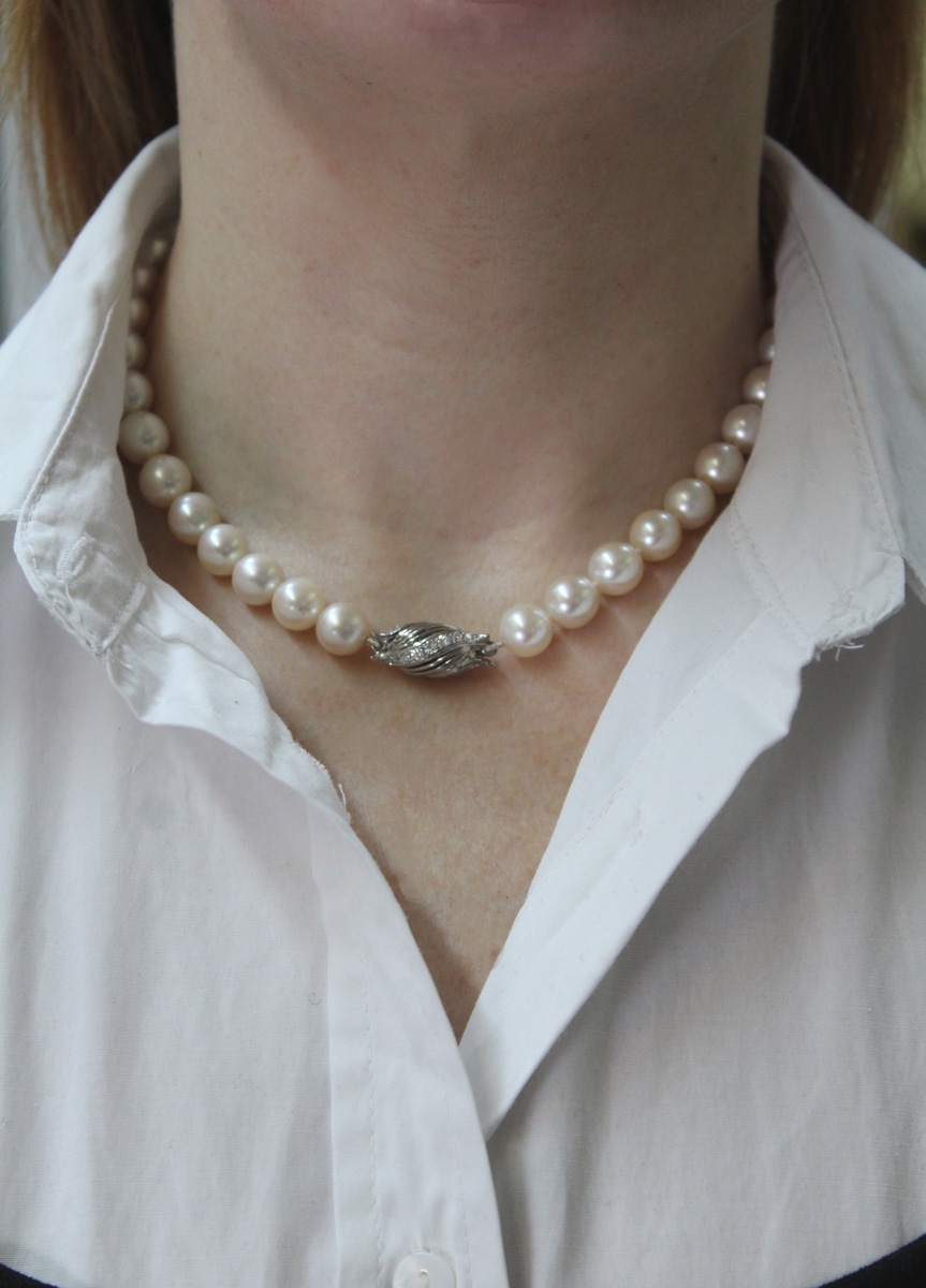 Perlenkette Akoyaperlen 9-9,2mm 27 Diamanten 0.72ct Weißgold 750. Ein absoluter Hingucker, die Blicke werden ihnen sicher sein. Länge 41cm, Gewicht 48,0 Gramm, 18 Karat Weißgold Schließe. Damenschmuck Perlenschmuck Perlenkette. Geschenkidee zeitloser Klassiker