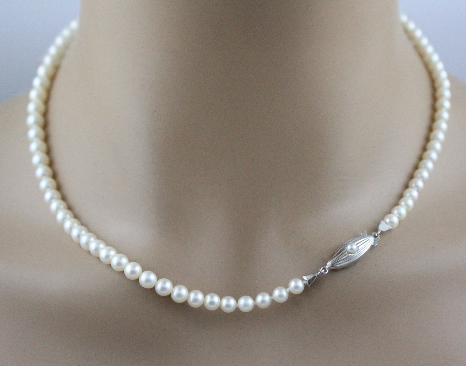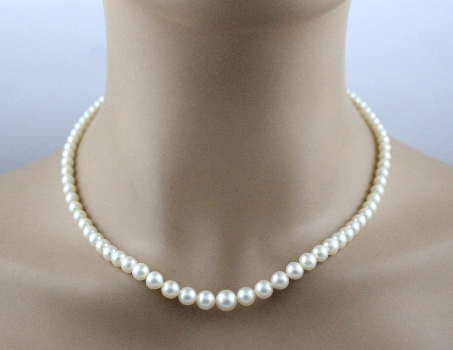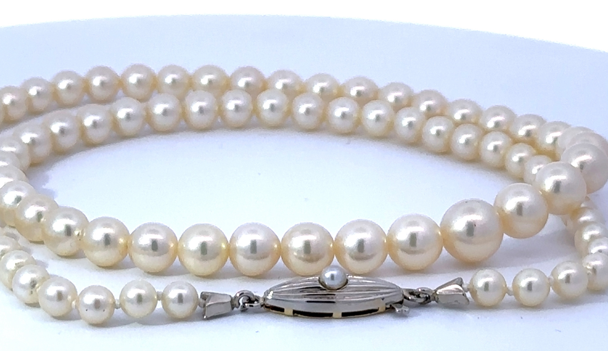 Perlenkette japanische Akoyaperlen 7.4-4.5mm Gelbgold 585. Ein absoluter Hingucker, die Blicke werden ihnen sicher sein. Länge 44cm, Gewicht 19,9 Gramm. Damenkette Damenschmuck Perlenkette. Geschenkidee zeitloser Klassiker