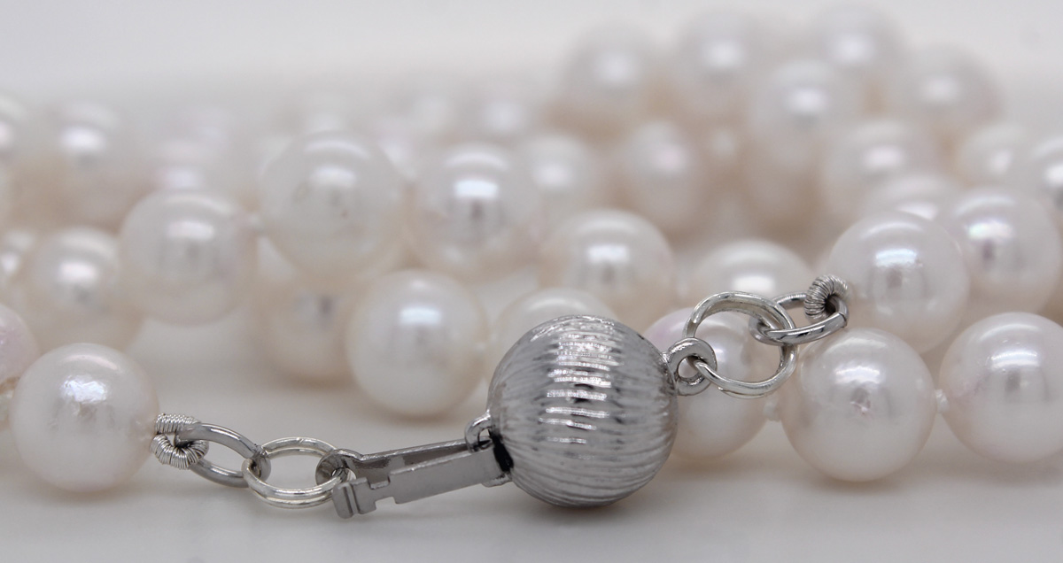 Japanische Akoyaperlenkette Sterlingsilber 925 Kugelschließe. Feine Japanische Akoyaperlen mit Sehr feinem, weißlippig strahlendem Perlenlustre. Schliesse: Kugelverschluss d:8,7mm in Silber 925, Gewicht: 25,50 Gramm, Kettenlänge: 45cm. Feines Perlenunikat, welches von Hand aufgezogen und geknüpft wurde. Ein imposanter und zeitloser Klassiker, welcher jedes Herz höher schlagen lässt