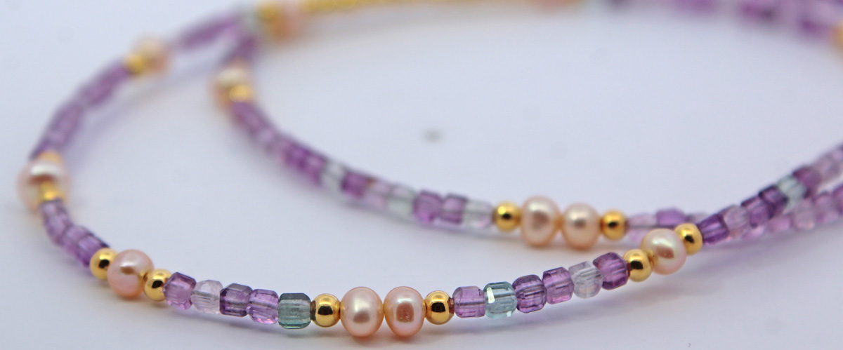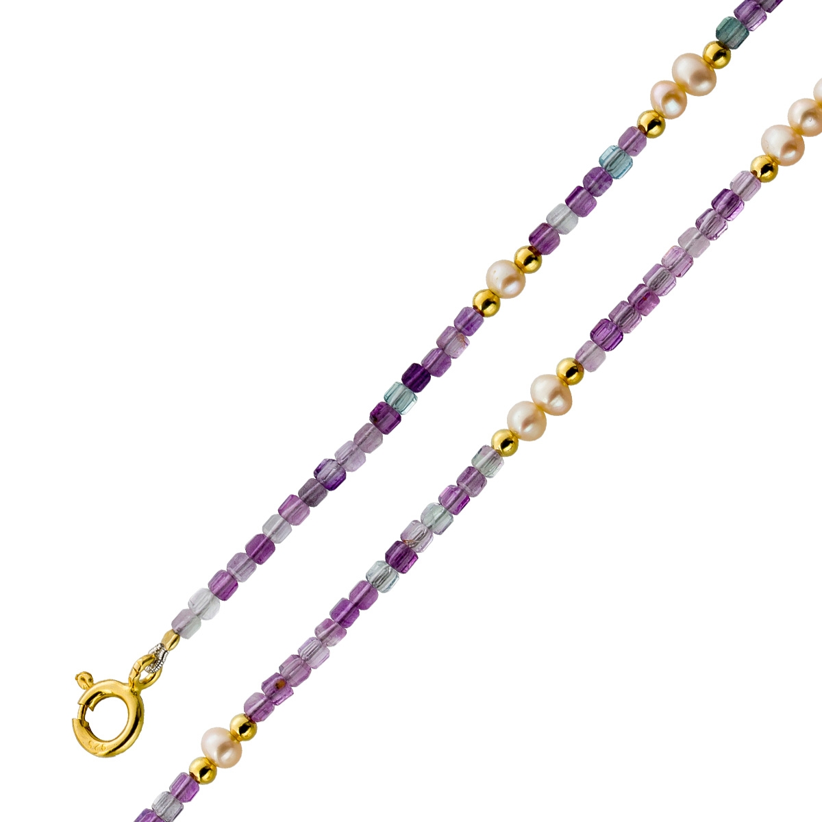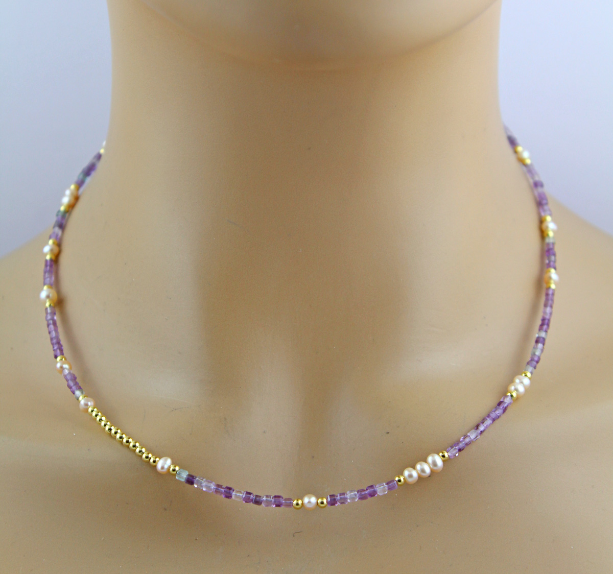 Perlenkette 47cm Süßwasserperlen Natur Fluorit Edelsteine. Ein absoluter Hingucker, die Blicke werden ihnen sicher sein. Perlen 4-4,4mm, Fluorite 2,2mm, 42+5cm, 5,8 Gramm. Damenkette Perlenkette Perlenschmuck Edelsteinkette. Tauchen Sie ein in die Welt der meisterhafter Goldschmiedekunst