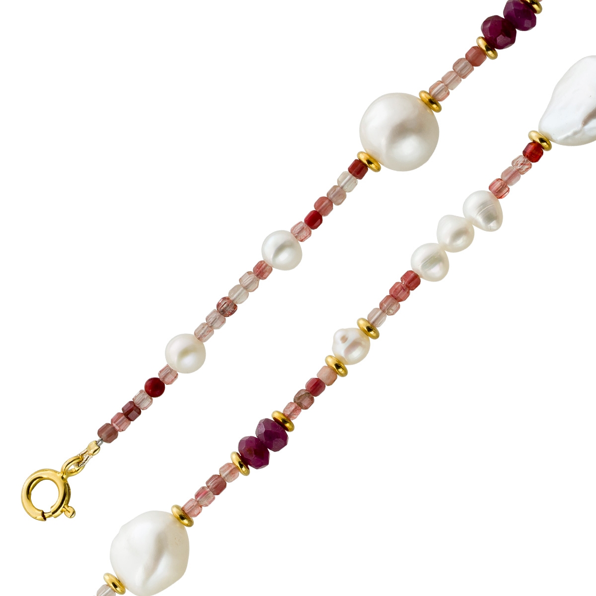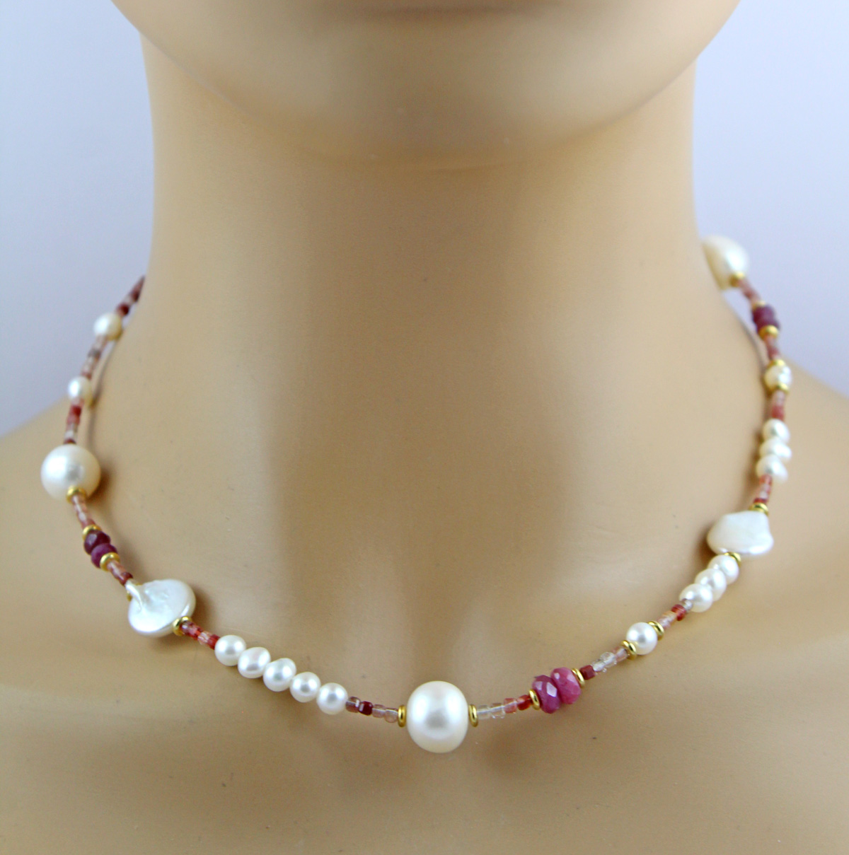 Perlenkette 47cm Süßwasserperlen Natur Rubin Andesin Edelsteine. Ein absoluter Hingucker, die Blicke werden ihnen sicher sein. Andesine 2,2mm, Rubine 4,8mm, Perlen 6,4-12mm, 42+5cm, 16,6 Gramm. Damenkette Perlenkette Perlenschmuck Edelsteinkette. Die Rubine sind naturbelassen, was ihre Einzigartigkeit und ihren Wert zusätzlich unterstreicht