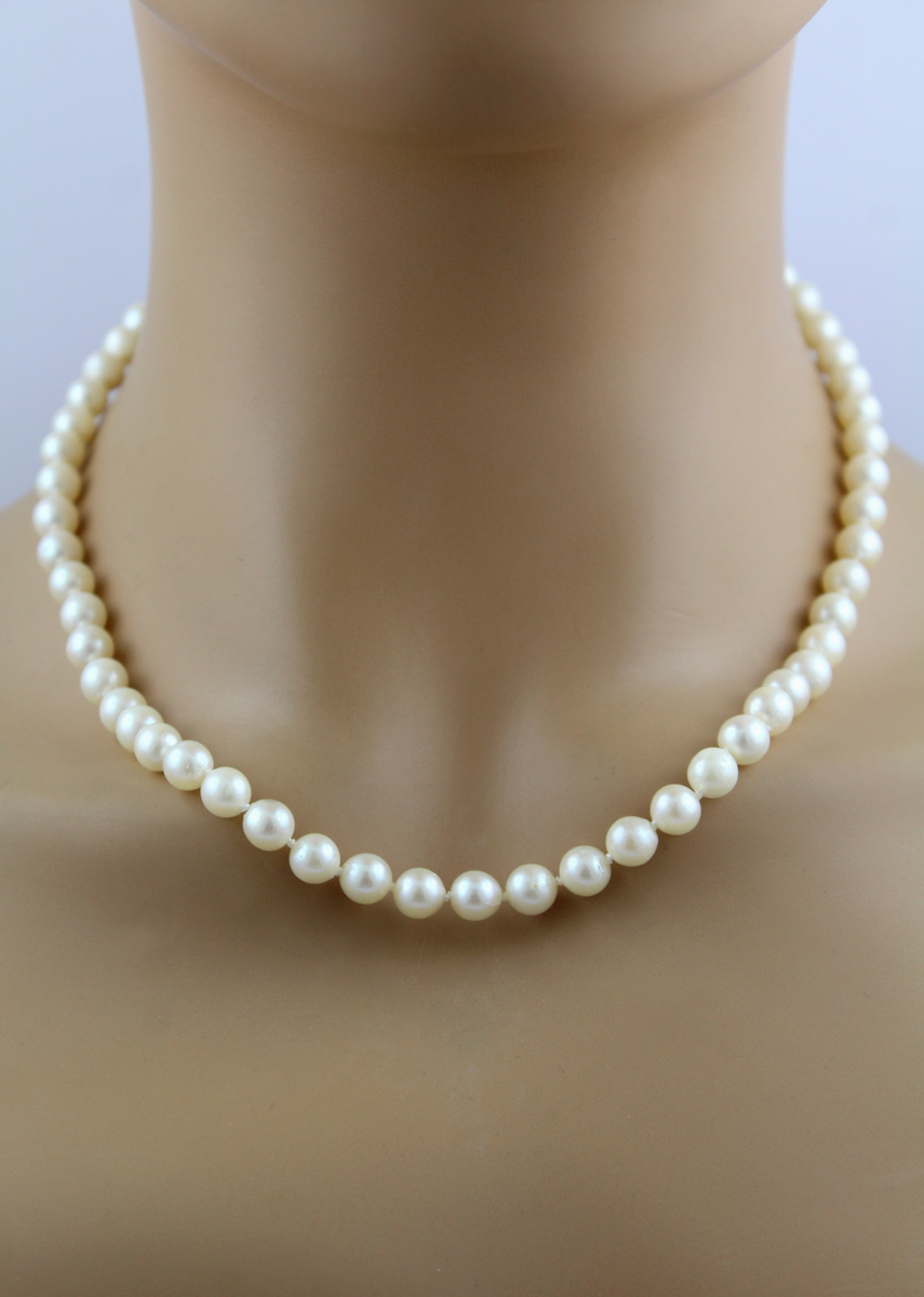 Akoyaperlen Kette Collier 48cm Gelbgold 333 8K Perlen 7.3-7mm Vintage 1930. Spezieller und zugleich traumhafter Schmuck für den Alltag oder auch zum Ausgehen. Länge 48cm, Gewicht 29,8 Gramm, Sicherheitsschließe LxBxH 21x8,3x6,3mm. Perlenkette Damenkette Perlenschmuck. Ein zeitloses Accessoire, das in keiner Schmucksammlung fehlen sollte