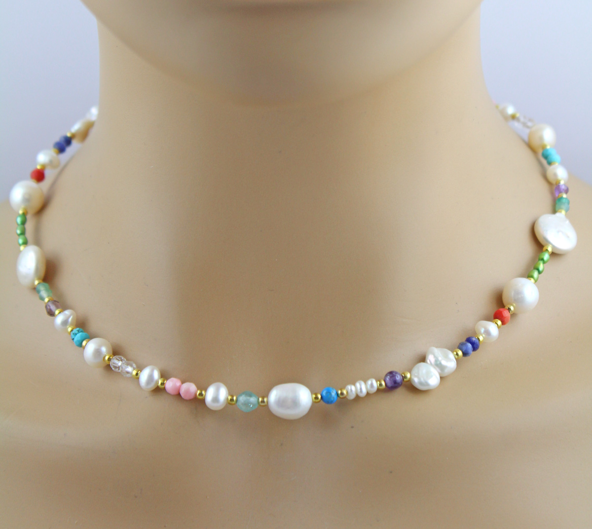 Perlenkette 48cm Süßwasserperlen Amethyste Türkise Bergkristalle Fluorite Lapis Koralle. Ein absoluter Hingucker, die Blicke werden ihnen sicher sein. Perlen 4-12,1mm, Edelsteine 3,6-4,6mm, 42+6cm, 16,8 Gramm. Damenkette Perlenkette Perlenschmuck Edelsteinkette. Dieses Schmuckstück ist ein Symbol für Klasse, das Generationen überdauert