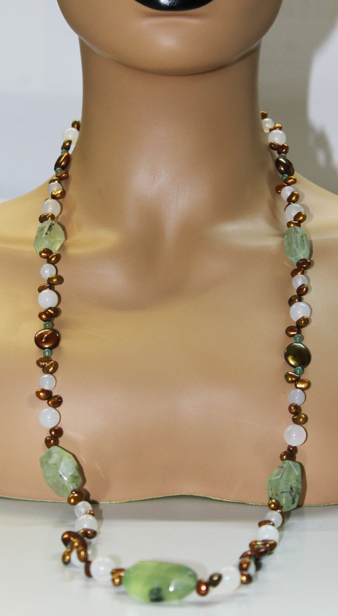 Eine wunderschöne Süßwasser Perlenkette mit echtem riesigem Phrenit Edelsteinen, feine Bergkristalle und toller Achat