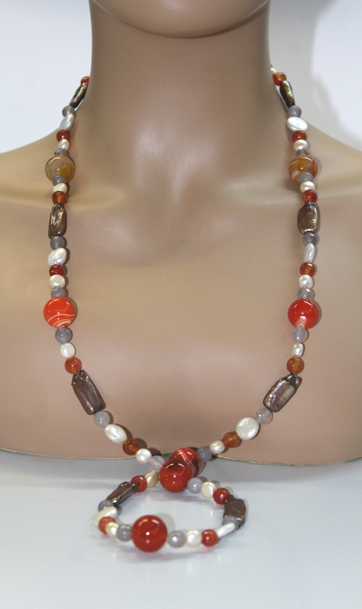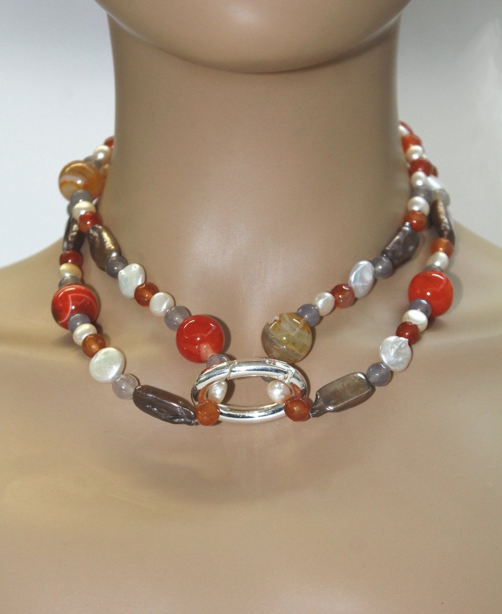 Eine wunderschöne Süßwasser Perlenkette mit echtem, grauen Achat. orangener Achat und rubinroter Carneol. Mit silberfarbenem Kettenverkürzer mit Scharnier und einer silberfarbenen, massiven Federringschließe.dochglanzpoliert. Feinste Süßwasserperlen in Barocker bis klassischer Knopfform und Süßwasserperlen Nuggets Natur. Länge: 90cm, Gewicht: ca. 121,07 Gramm. Einzigartig schön mit vielen Tragevarianten