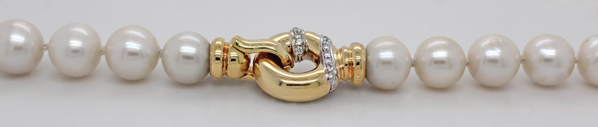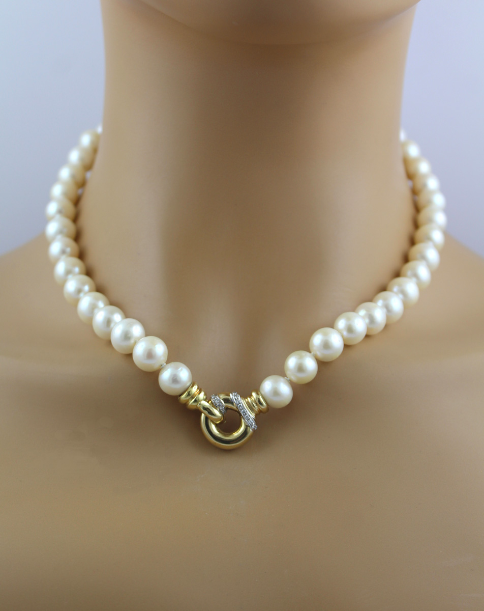 Perlenkette Edison Perlen 9.9-9.4mm Gold 750 Brillanten. Auffällige Perlenkette mit strahlenden Edison Perlen. 47cm, 63,3 Gramm. Damenkette Perlenkette Goldschmuck. Eine exquisite Ergänzung für Ihre Schmucksammlung