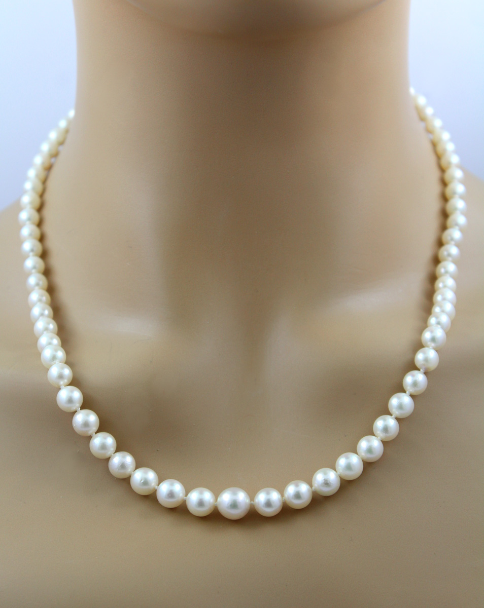 Perlenkette japanische Akoyaperlen 5.1-8.6mm Silber 925. Ein absoluter Klassiker, welcher alle Blicke auf sich ziehen wird. Gewicht 26,84 Gramm. Damenkette Damenschmuck Perlenkette. Geschenkidee zeitloser Klassiker