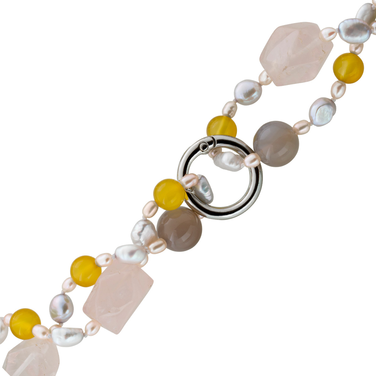Perlenkette Süß grauer gelber Achat Rosenquarz Natur Edelsteine. Achat wird oft als Stein der Erdung und Stabilität angesehen. Gewicht 101,21 Gramm, Kettenverkürzer Durchmesser 24,9mm. Damenschmuck Edelsteinschmuck Damenkette Perlenkette. Geschenkidee zeitloser Klassiker