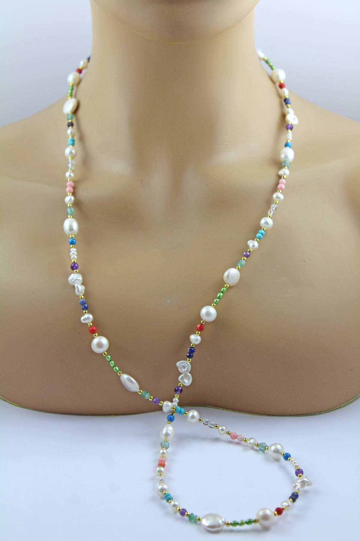 Perlenkette Süßwasserperlen Amethyste Türkise Fluorit Carneol Bergkristall. Ein absoluter Hingucker, die Blicke werden ihnen sicher sein. Perlen 4-12,1mm, Edelsteine 3,7-5,1mm, 92cm mit Kettenverkürzer, 37,7 Gramm. Damenkette Perlenkette Perlenschmuck Edelsteinkette. Tauchen Sie ein in die Welt der meisterhafter Goldschmiedekunst