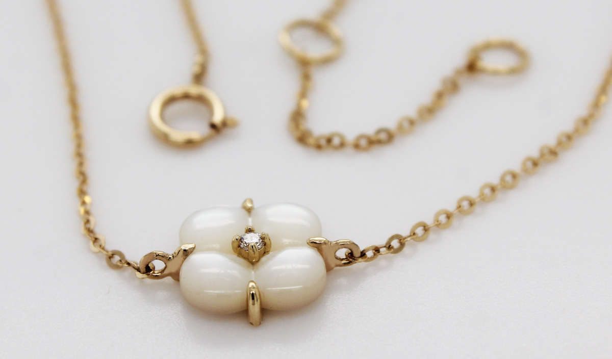 Armband Gelbgold 585 1 Kleeblat Perlmutt 1 Brillant 0,015ct TW/VSI. Spezieller und zugleich traumhafter Schmuck für den Alltag oder auch zum Ausgehen. Länge 18+3cm Gewicht 1,03 Gramm Ketten Breite 1,0mm. Geschenkidee zeitloser besonderer Klassiker. Ein zeitloses Accessoire, das in keiner Schmucksammlung fehlen sollte