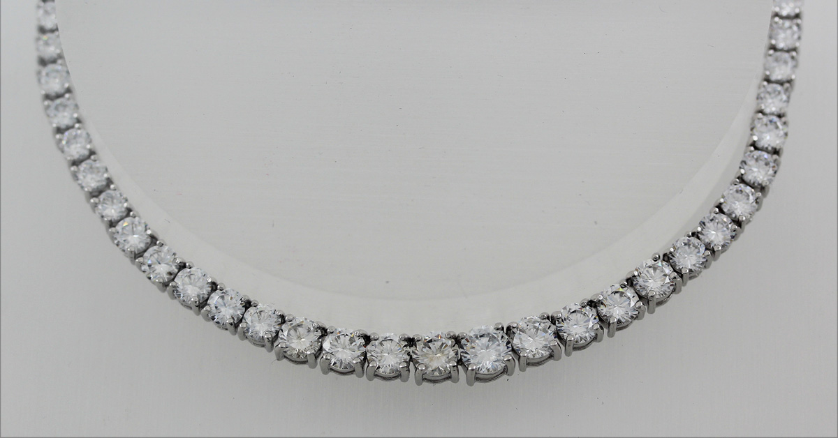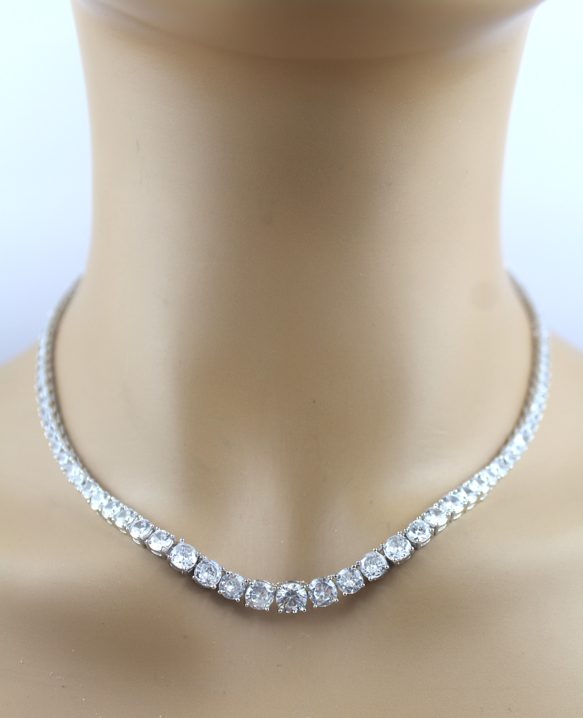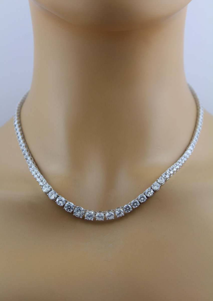 Riviere Collier Sterling Silber 925 weiße Zirkonia. Die Zirkonia befinden sich in einer Top Qualität und sind von echten Brillanten nicht zu unterscheiden. Länge 45cm, Gewicht 24,5 Gramm, Breite 2,1-4,5mm, Stärke 2,6mm. Damenkette Damenschmuck. Ein imposantes Collier, welches alle Blicke auf sich ziehen wird