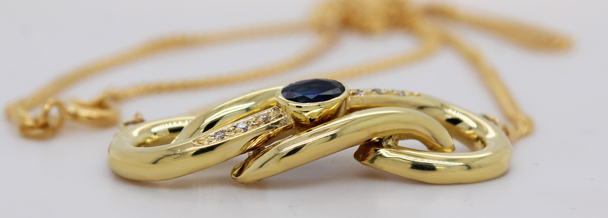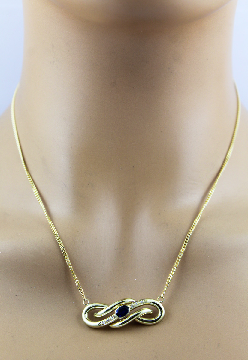 Infinity Collier Gelbgold 585 blauer Saphir 1.07ct. Diamanten 0.06ct. Ein wunderschönes Collier welches im Zeichen der Unendlichkeit steht. Maße: Mittelteil 34,8x12,8x7,1mm, Kette 1,8x0,8mm, Kettenlänge 40cm+5cm, Gewicht: ca. 9,44 Gramm. Geschenkidee zeitloser besonderer Klassiker. Ein zeitloses Accessoire, das in keiner Schmucksammlung fehlen sollte