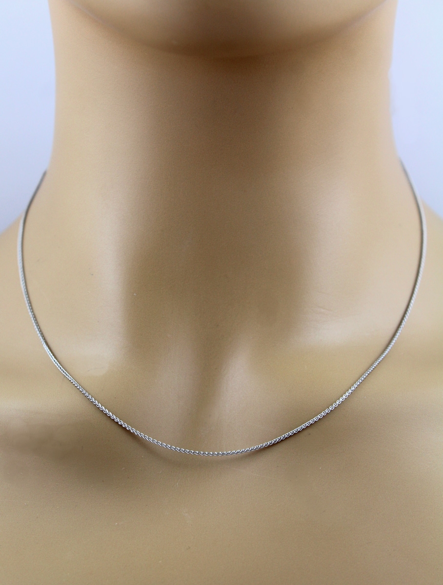 Feinste Zopfkette Spiga Kette im Weißgoldlook in Silber 925 Rhodiniert Durchmesser 1,1mm. Damen und Herren Halskette. Legierung Silber 925 (Rhodiniert= macht einen schöne Weißgoldlook und bietet einen tollen Anlaufschutz) Durchmesser 1,1mm. Längen 38cm,40cm,42cm,45cm. Gewicht 38cm-1,4g/ 40cm-1,5g / 42cm-1,6g/ 25cm- 1,7 Gramm. Schließe Karabiner massiv
